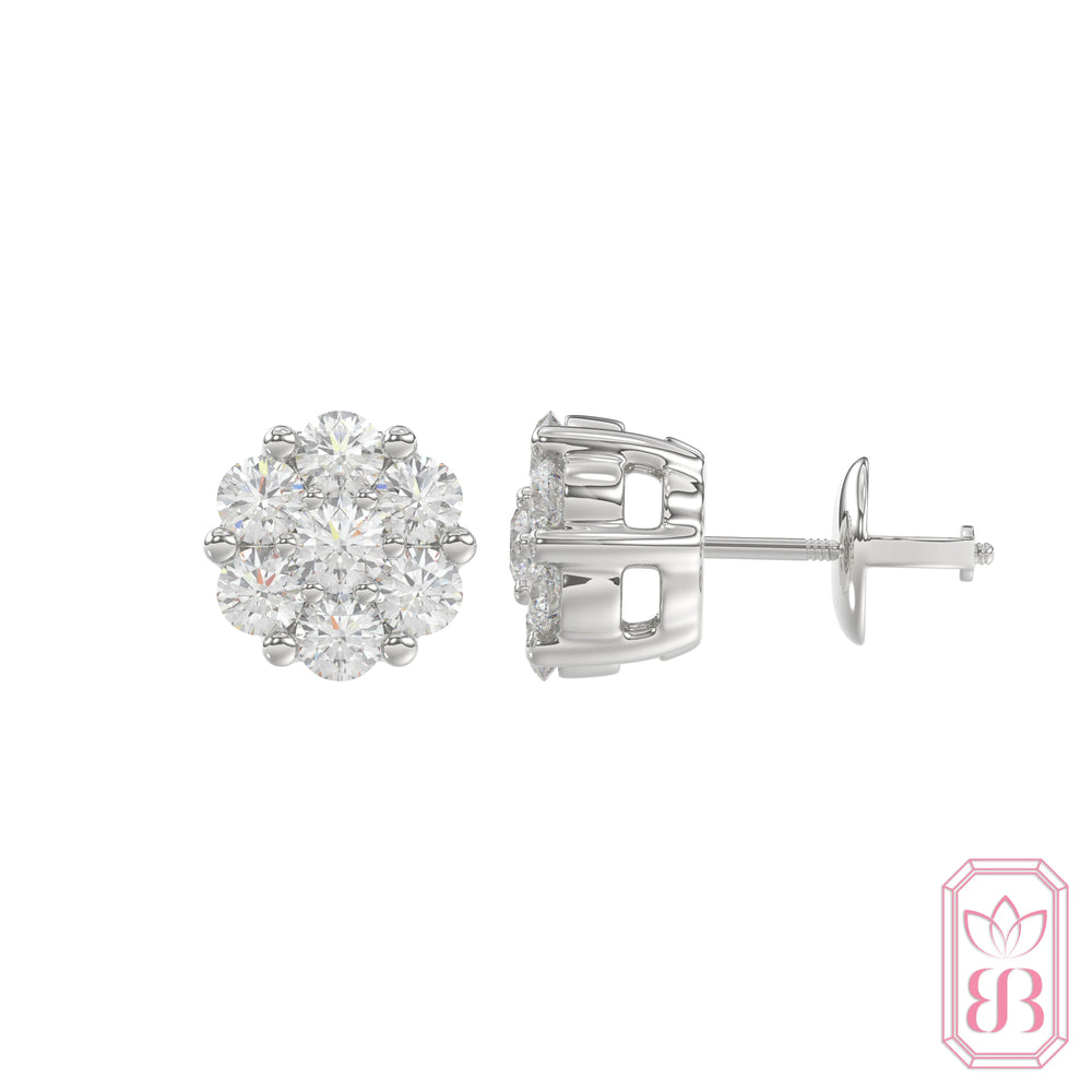 A cluster of round brilliant diamonds forms a full, dimensional silhouette with soft edges and strong coverage. The look is classic, but the impact feels modern — substantial without being heavy.